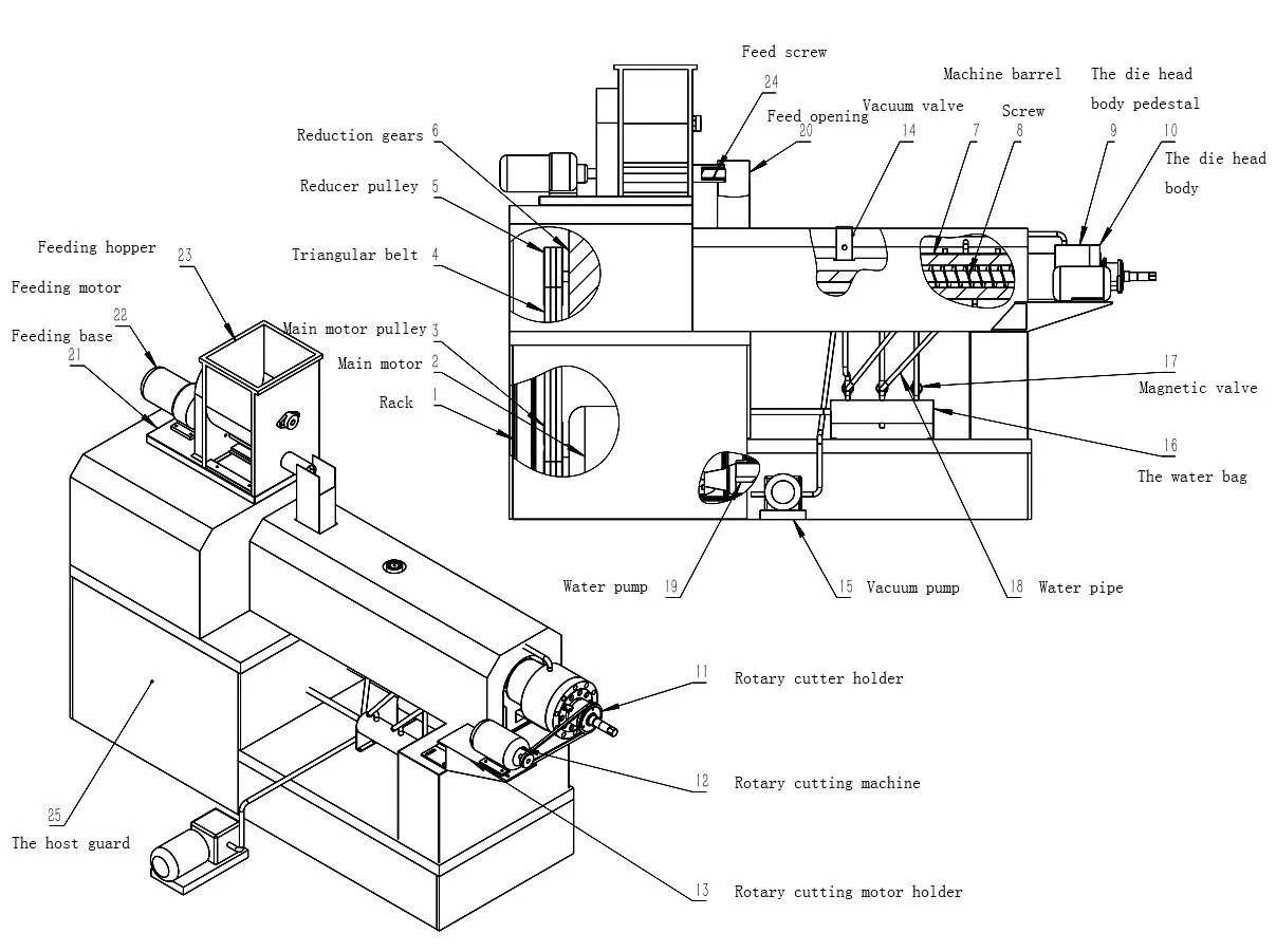 Tootmisliin kasutab toorainena peamiselt kartulitärklist, maisitärklist ja jahu ning ainulaadset ekstrusioonvormimistehnoloogiat, et toota turul populaarset erineva kujuga sekundaarset paisutatud toitu. Tootmisliini eelised on mõistlik disain, kõrge automatiseerituse tase, ekstrusiooniparameetrite täpne juhtimine, põhimasina kõrg- ja madalrõhukruvid, mis suurendab toormaterjalide kasutusala, vähendab kulusid ja parandab toodete kvaliteeti. Peamised tooted on spiraal, kest, ümmargune toru, ruudukujuline toru, ring, koomiksikuju, spordi kuju ja nii edasi.